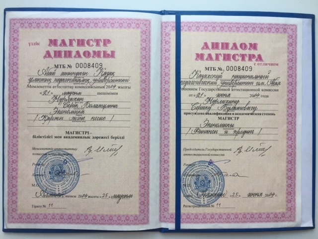 2004 г. с отличием окончил Магистратуру Алматинского государственного педагогического университета имени Абая (магистр экономики).