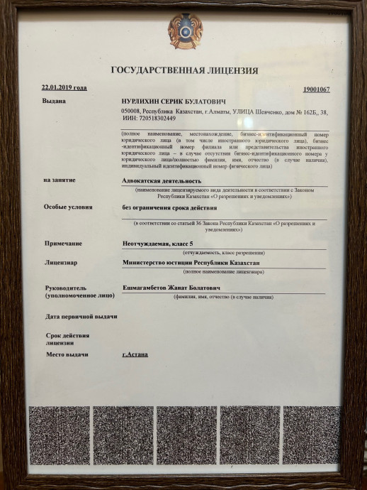 Контакты: г. Алматы ул. Шевченко, 102 нежилое помещение 4, тел. 87471506840 , e-mail nurlikhinadvocate@gmail.com
